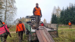 Alanud sügisesel ühisjahihooajal kutsusime kõiki jahinaisi üle Eesti osalema “jahis ainult naised 2025” suurulukijahil Põlva Jahiseltsis, Mäe jahtkonnas! Sellel aastal oli plaanis lisaks põdrajahile ka teha ajujaht šaakalile. 25-nda oktoobri hommikul koguneski 25 jahinaist ja terve Mäe jahtkonna jahimehed, -jahinaised ning päev algas kohvi, võileibade ja tutvustamistega. Kui juba nimed nimekirja said, kogunesime õuele ning Aare Poolak tutvustas Mäe Jahtkonna kujunemislugu ning Madis Poolak tutvustas jahipäeva ülesehitust, reegleid, jahiohutust. Nagu ikka jagasid kohalikud jahimehed kütiliinid ära ning ka jahinaised juhatati positsioonidele. Kohe kui aju algas, hakkasid usinad taksid, Puru ja Barka, klähvima ja võtsid värske jälje üles. Natuke sebimist siia-sinna ajuliinis koertega ja esimesed põdrad jõudsid ka kütiliini. Esimese põdra pihta tegi lasu jahinaine Juulia, sai pihta ja põdrapull kukkus, siiski loom tõusis ja liikus edasi. Ka jahinaine Agnese eest käis haavatud loom läbi ning naisel õnnestus sooritada lask, põder liikus võsa vahele. Vahepeal oli tulnud ka veel üks kütitav loom Juulia ette. Sedakorda läks õnneks ja loom sai kütitud. Kui ajajad jõudsid kütiliini, organiseerisid koeramhed kohe verejälje otsingu ning taksid võtsid hoobilt verejälje üles. Haukusid ja jooksid, siiski jäid nad üsna tõenäoliselt loomast tunduvalt maha ning kohale jõudnud ida-siberi laika sai jätkata takside alustatud tööd. Kuigi oli ka omajagu segadust, sest vahepeal nähti seakarja, kes tuli üllatusena selles ajus ning hetkeks jäi mulje, et laika võttis hoopis seakarja ette. Kütid seati ümber järgmiste metsade ja ülejooksudele ning kui laika ikkagi põdrpulliga esimese küti eest läbi käis, oli selge, et laika ajab õiget looma. Kui juba koer otsitud põdrapulli täpse käega kütt Mihklile ette lükkas ja too eduka lasuga looma küttis, olid jahimehed rahul -kõik läks nii nagu pidi, koer sai kiita (mõne kena seibi suitsuvorstigi) ja päev läks edasi.